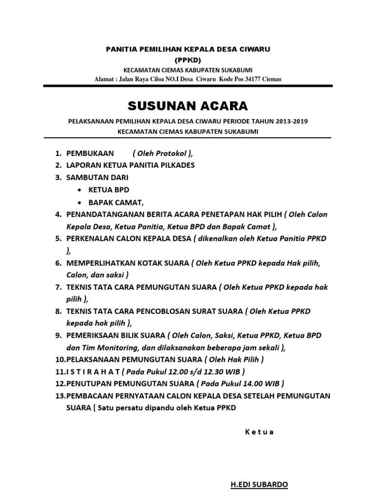 Panitia berharap kerjasama dan saling mengutamakan kesadaran satu sama lain menetukan sikap memilih pula adalah hak asasi setiap individual masyarakat untuk itu bersikap bijak dan terutama kepada panitia saya menghimbau selaku ketua panitia pemilihan kepala daerah tingkat desa ini kepada jajaran segenap panitia diharapkan bersikap netral. Contoh dok kelengkapan pilkades pancawati. Teks sambutan adalah kumpulan kalimat atau kata kata yang disampaikan.